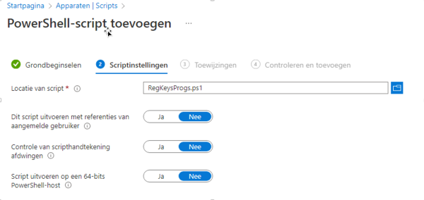 We gaan nu terug naar Endpoint waar we het script kunnen uploaden en alle vinkjes op Nee kunnen zetten.
