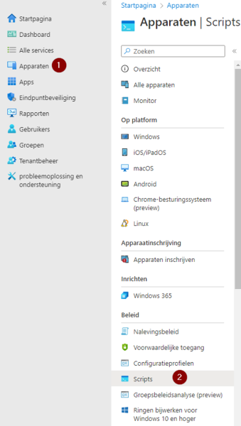 - Vanuit het menu open je Apparaten (1), in de nieuwe pagina klik je het submenu Scripts aan (2).